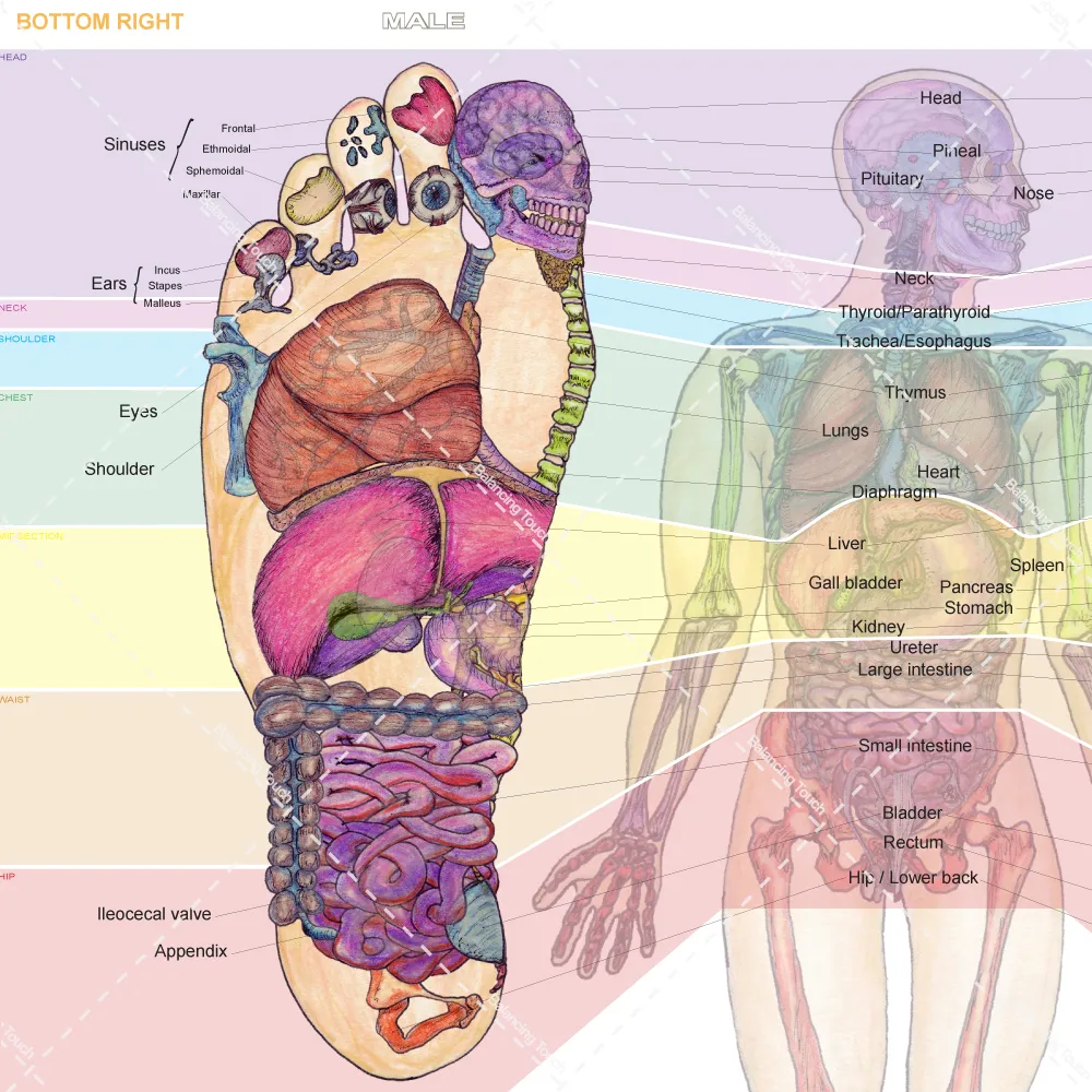 Refleksolojiye göre, ayak tabanında vücudun tüm organlarını temsil eden belirli noktalar bulunmaktadır. Örneğin;